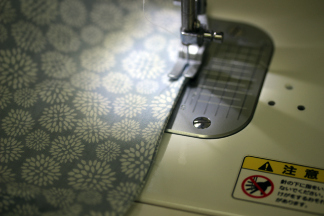 外布は3枚をはぎ合わせるタイプですので、布の上下に気を付けて、ボトムになる布に上側の布を縫い合わせます。