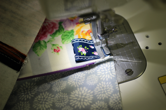 タブを縫い付け。後回しにすると忘れがちですが、ファスナー付け前につけていると縫いづらい事があるので。